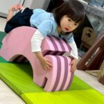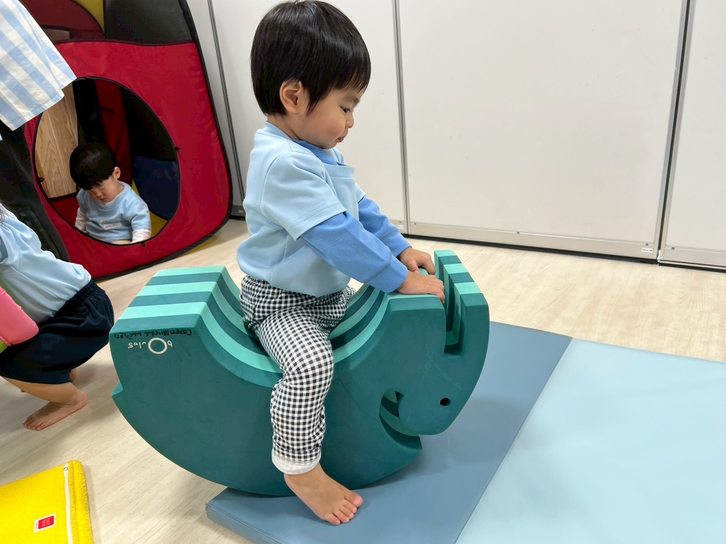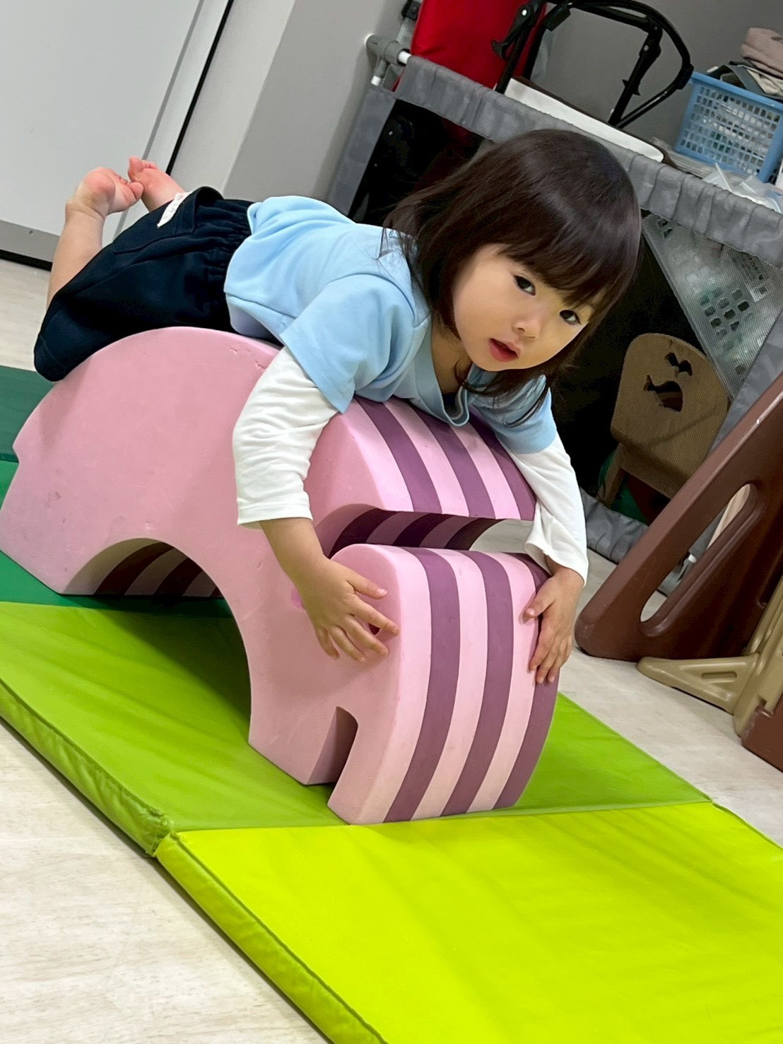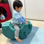 トンネルを抜けるとそこに友達がいて「かっかっかっ」と笑いあったり、ゾウさん遊具によじ登り、両手両足をぴんと伸ばして飛行機みたいになったり、伝い歩きを頑張ったりして身体全体を使って遊びました😆💕