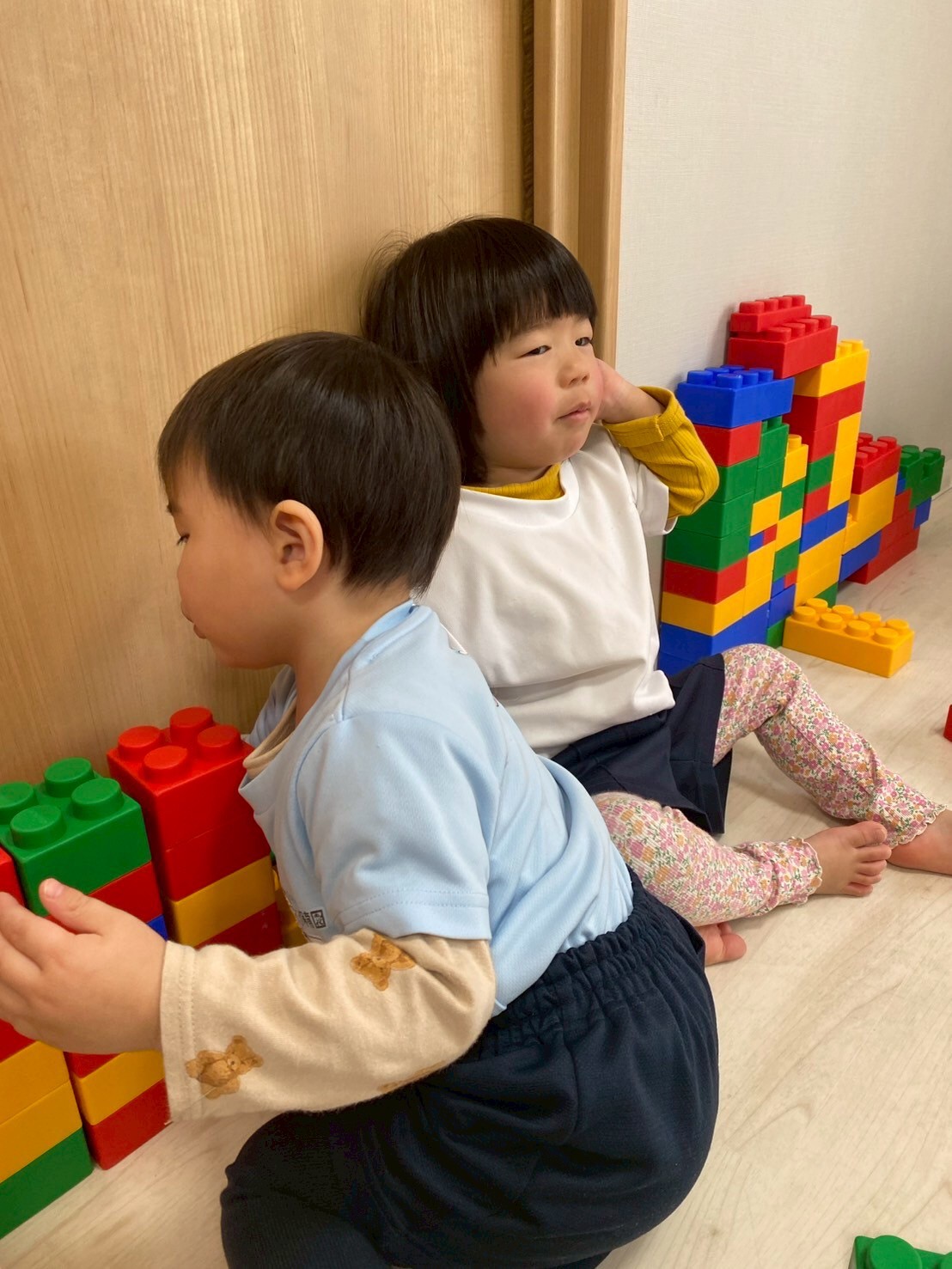 その後ブロック遊びでは🟥🟦🟩🟨何色が好き?と好きな色を選んだり、高く積みたい✨と積んでみたり、お城を作ったよ〜と楽しんでいました🏯