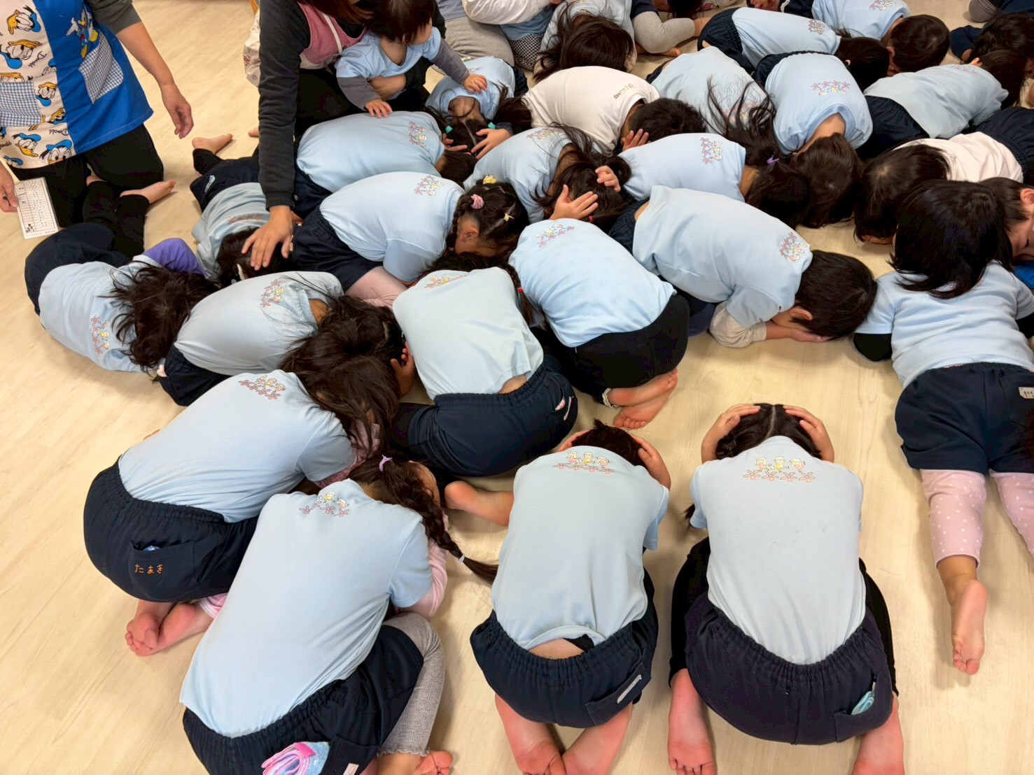 今日は朝の会中に地震の避難訓練がありました🔔突然の放送にびっくりしながらも『地震』の放送をしっかりと聞き、お部屋の中央に静かに集まってダンゴムシのポーズで頭を守り避難することができました。小さい組さんが怖がり泣いている子もいましたが、おっきいくみさんは『おはしも』の約束をしっかりと守り頑張りました✨
