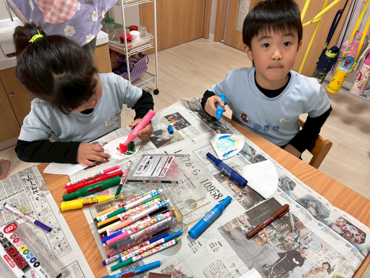 ひな祭り製作の続きではコーヒーフィルターを使って、おだいりさまとおひなさまの着物を作ったり、顔を切って描いたりましたよ🎎🌟