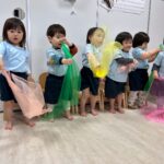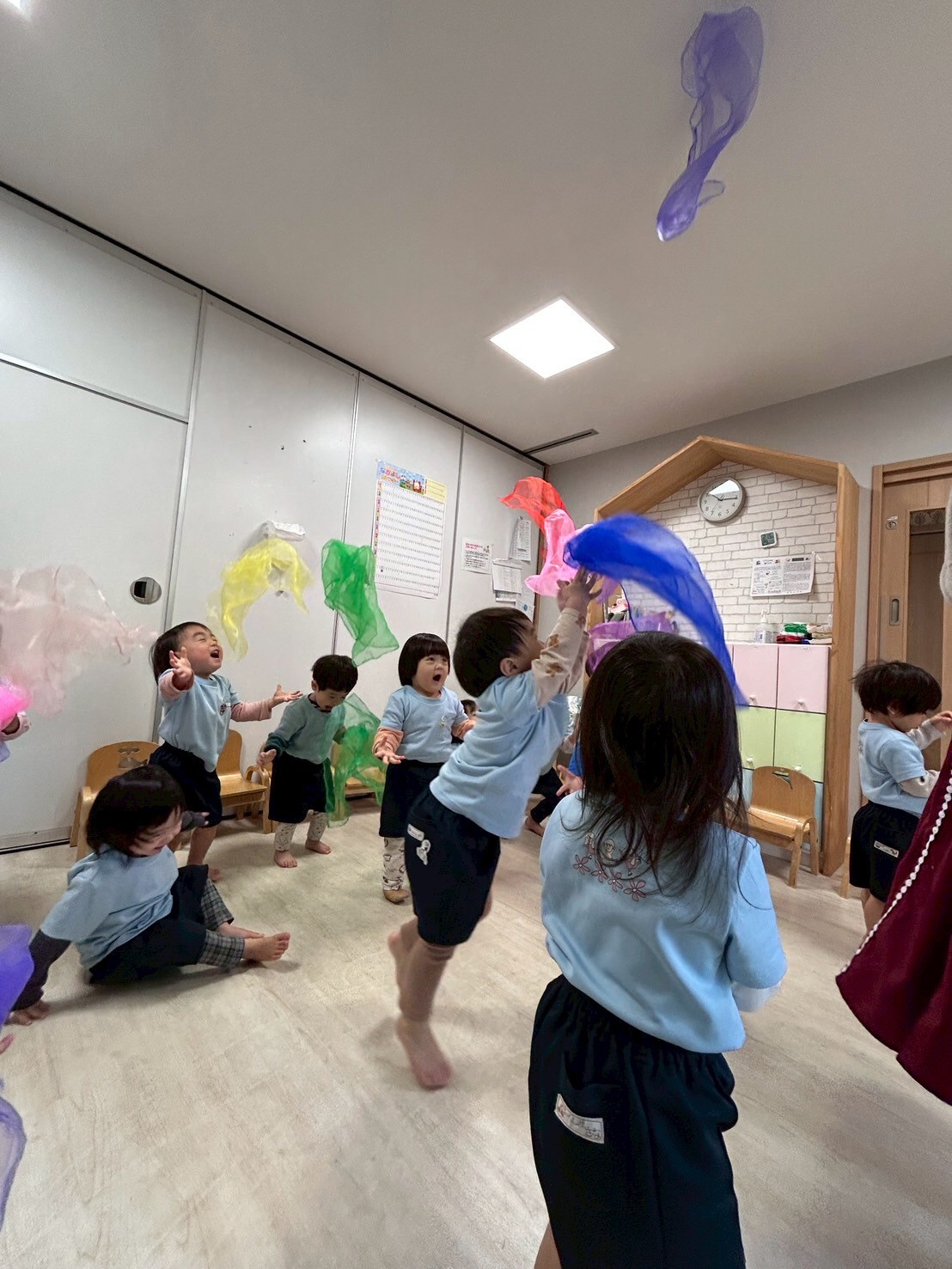 リトミックでは音符を見て手を叩いたり、ジャンプしたり、みんなとっても楽しそう😘ピアノに合わせて動くことも上手になっています♪💕みんなが大好きなシフォン布でのかくれんぼは、もはやリトミックの定番になりつつあります😁
