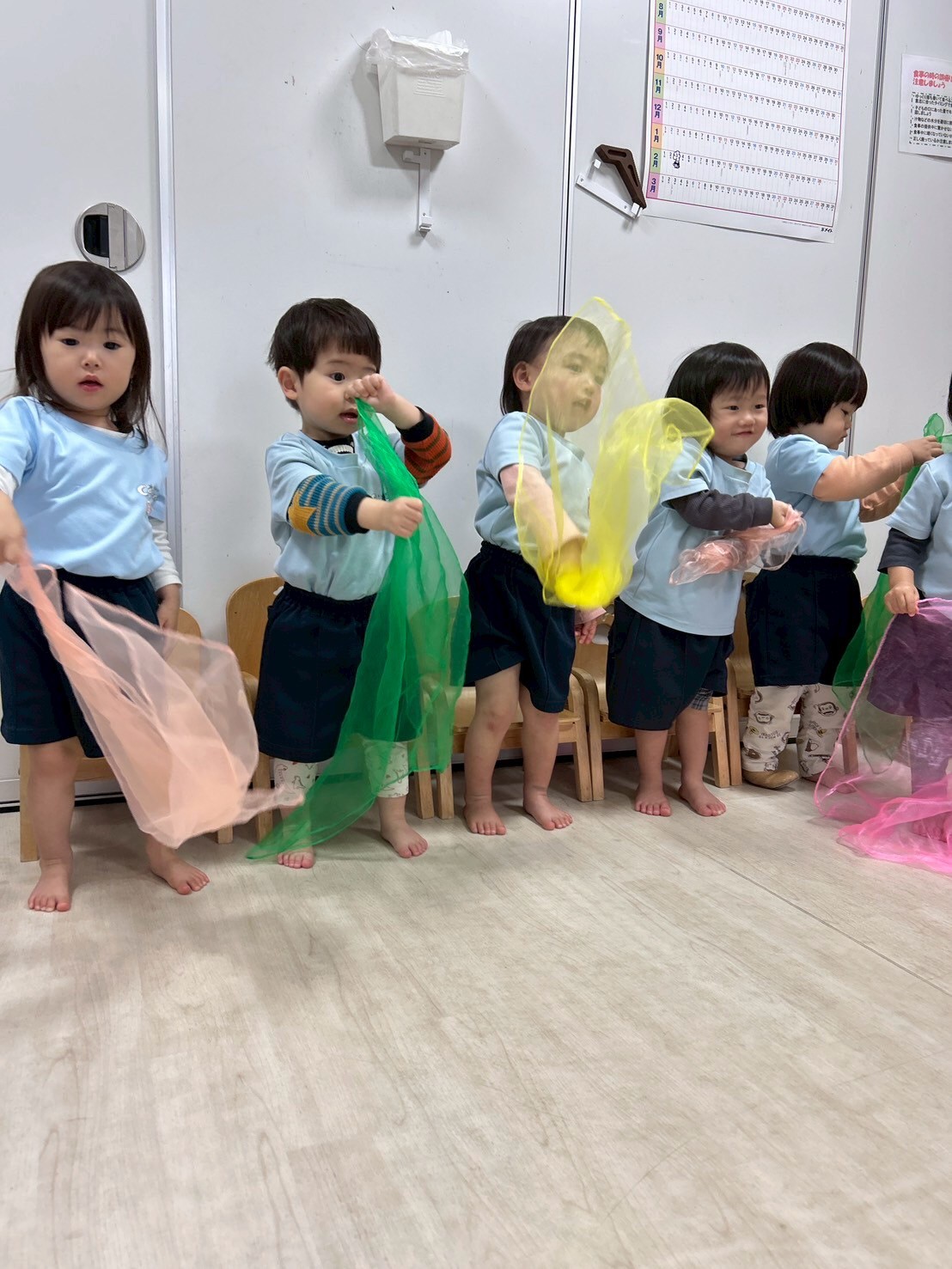 その後は大好きリトミック❤️😘終始楽しそうにカラースカーフや卵マラカス🥚楽器を動かし、リズム遊びを嬉しそうにしていました😍