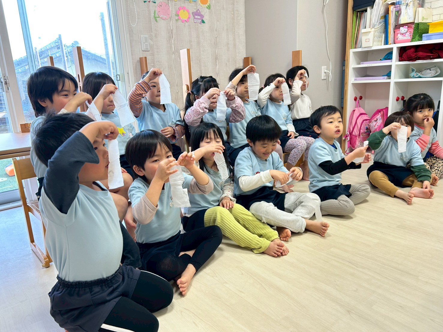 次は、鼻のかみ方指導を看護師の先生にしてもらいました👃「優しく」「ゆっくり」「少しずつ」の約束を守りながら練習しました✨鼻水が出ている子が増えているので、こまめに取れるように心がけていきたいと思います🤗それから散歩の準備をして、みんなで電車を見にいきました🚃‼️歩道橋から電車を見たり、歩道橋でかけっこしたり大盛り上がりでした🤩
