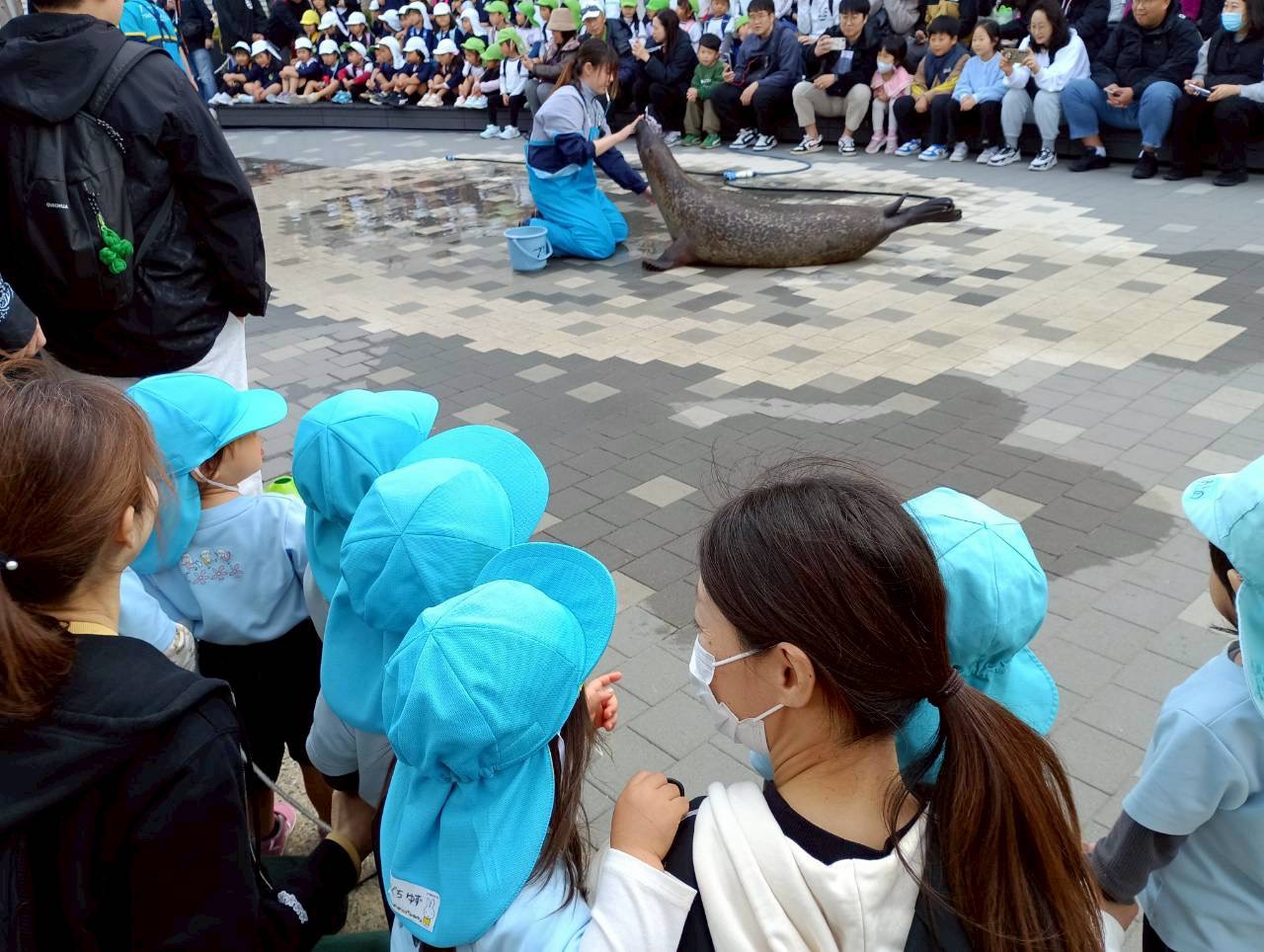 ゴマフアザラシのショーではお腹を使って移動する姿が可愛くてみんな釘付けでした!イルカのショーも観ることができ高くジャンプしたりスイスイ泳ぐ姿をみて色んな良い刺激をうけることができたことと思います🥰