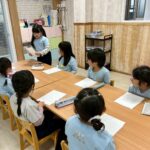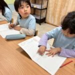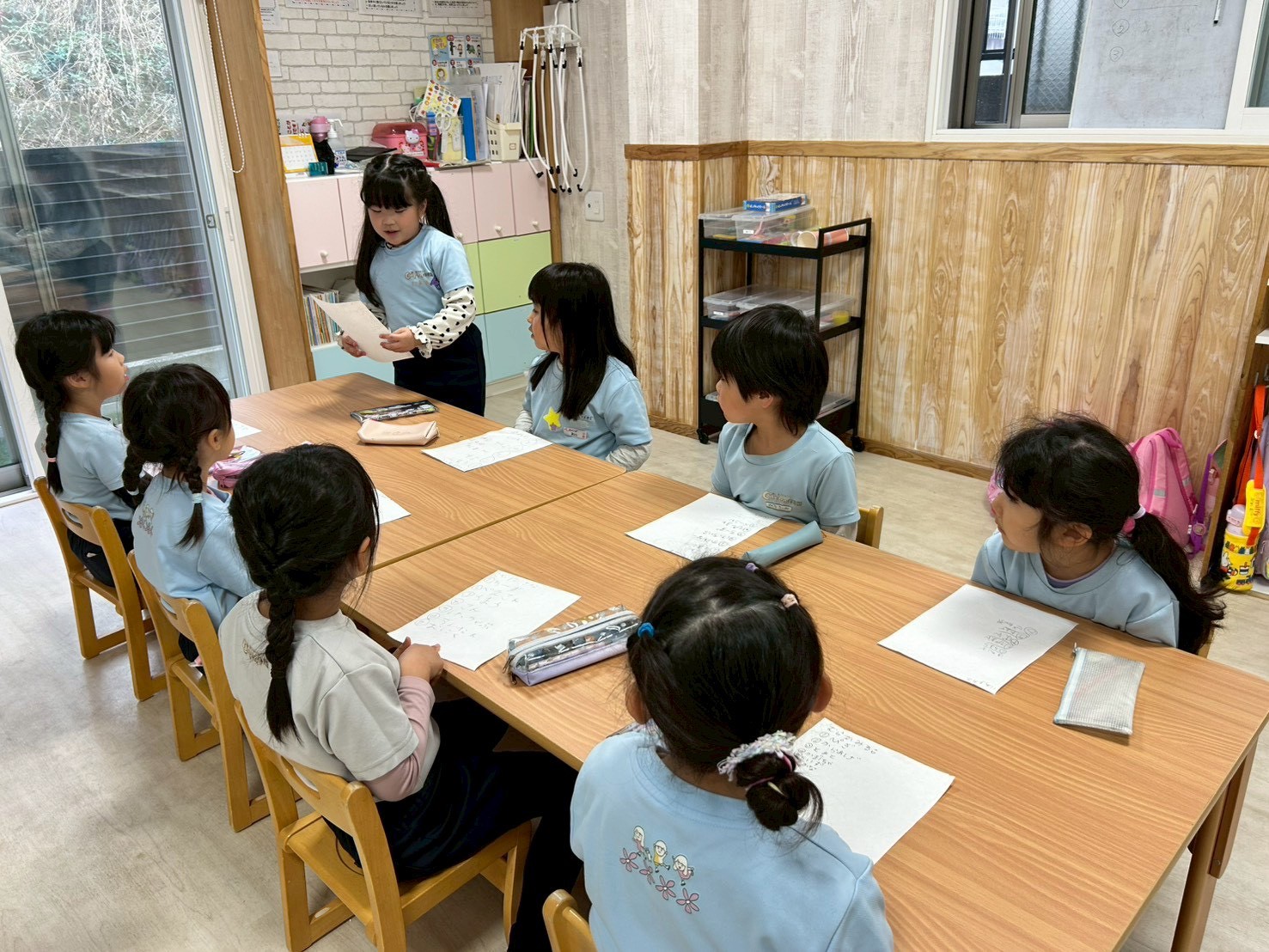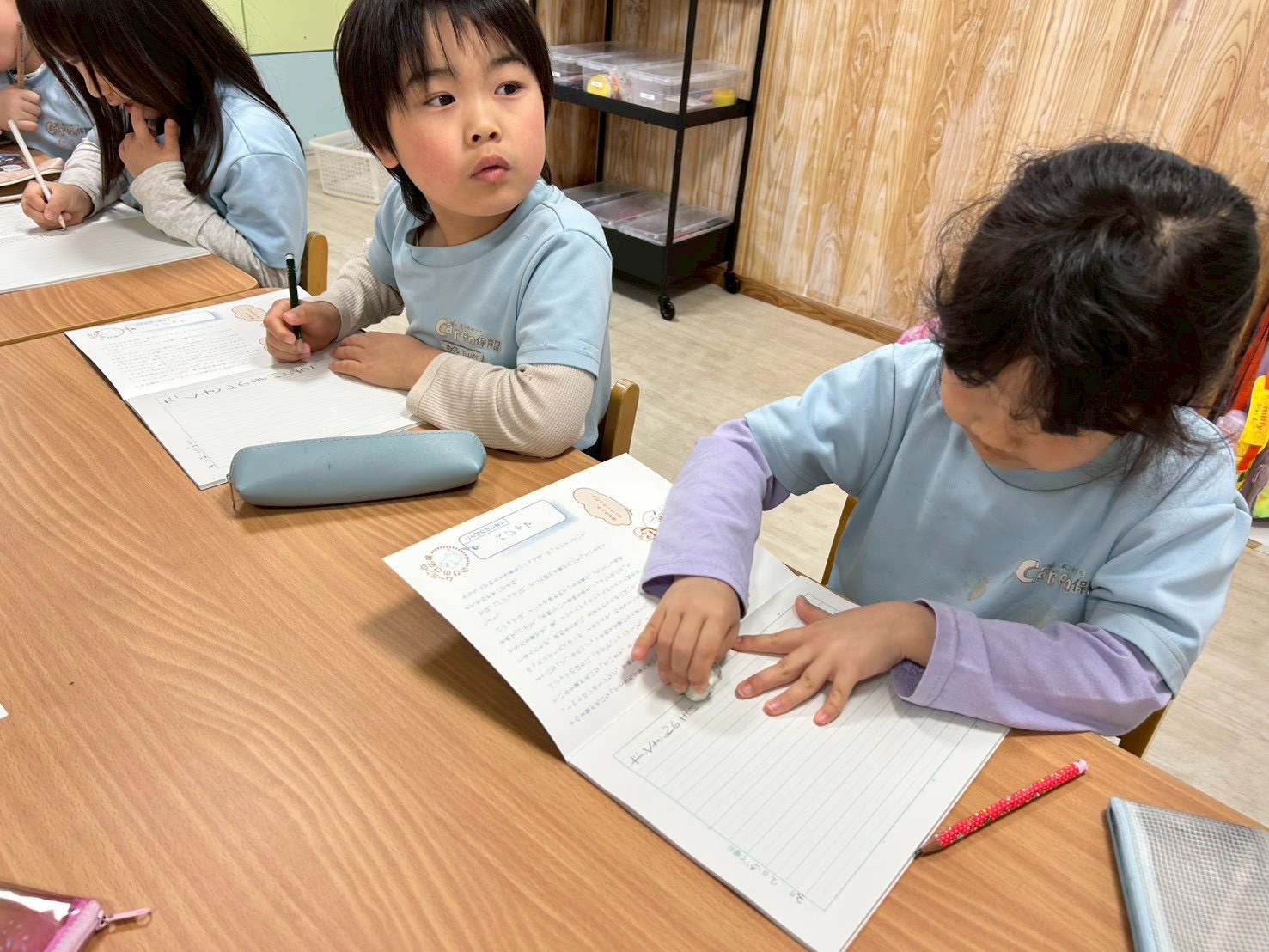 初日の今日は今度のクッキングで作る「ピザパン」の具材を考えました🍕それぞれに考え、その後に発表を行いました❣️ドキドキしている子も多かったですが緊張感もありとても良い雰囲気でした🤗次に卒園式で歌う「さよならぼくたちの保育園」の歌詞をノートに写しました✏️🌟いわゆる板書と言われるものですが、話し言葉と書き言葉の違いに戸惑ったり、読めるけど書けない文字があったり苦戦していましたが、よく集中して頑張っていました👏✨
