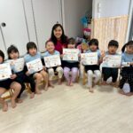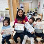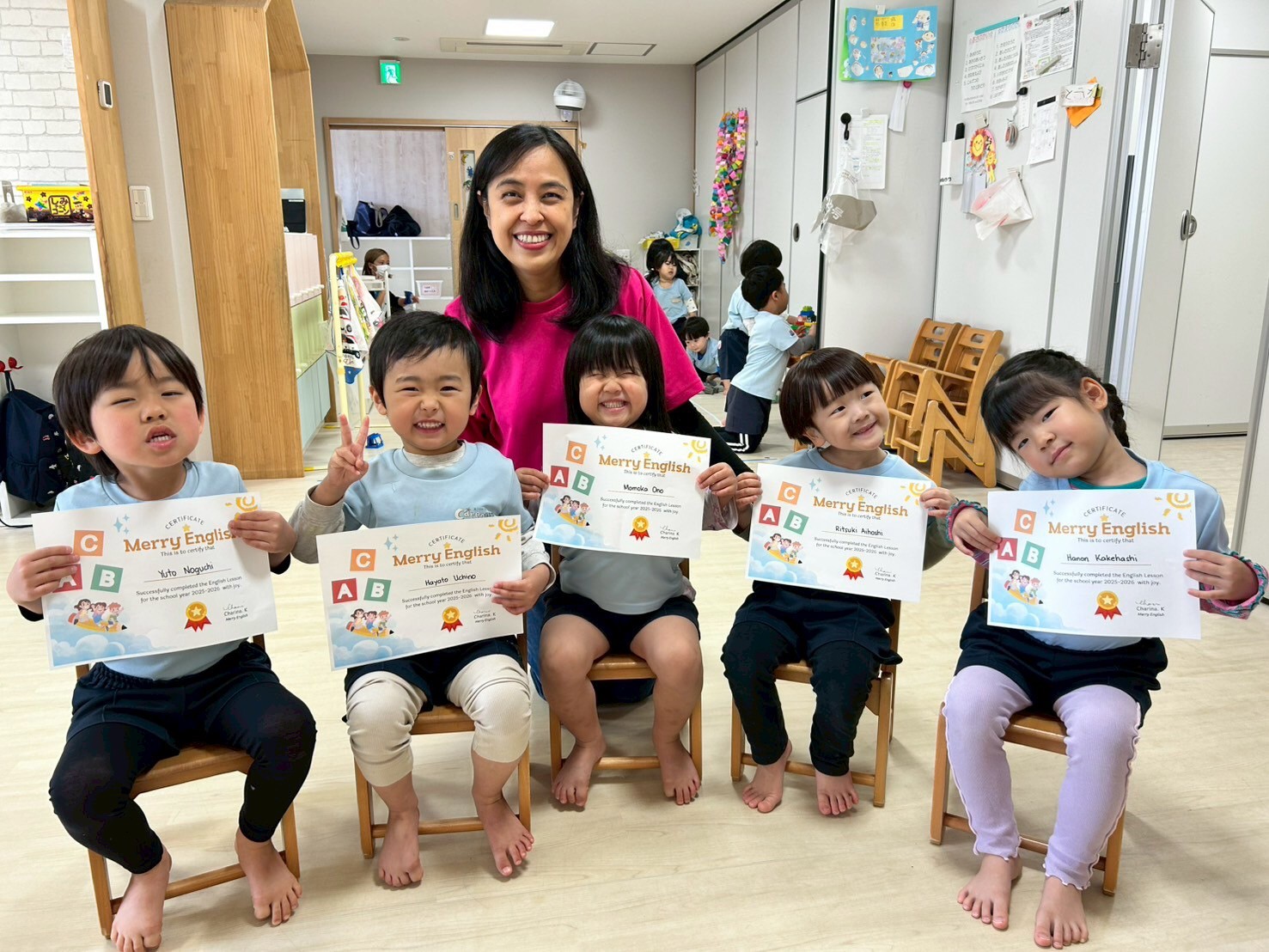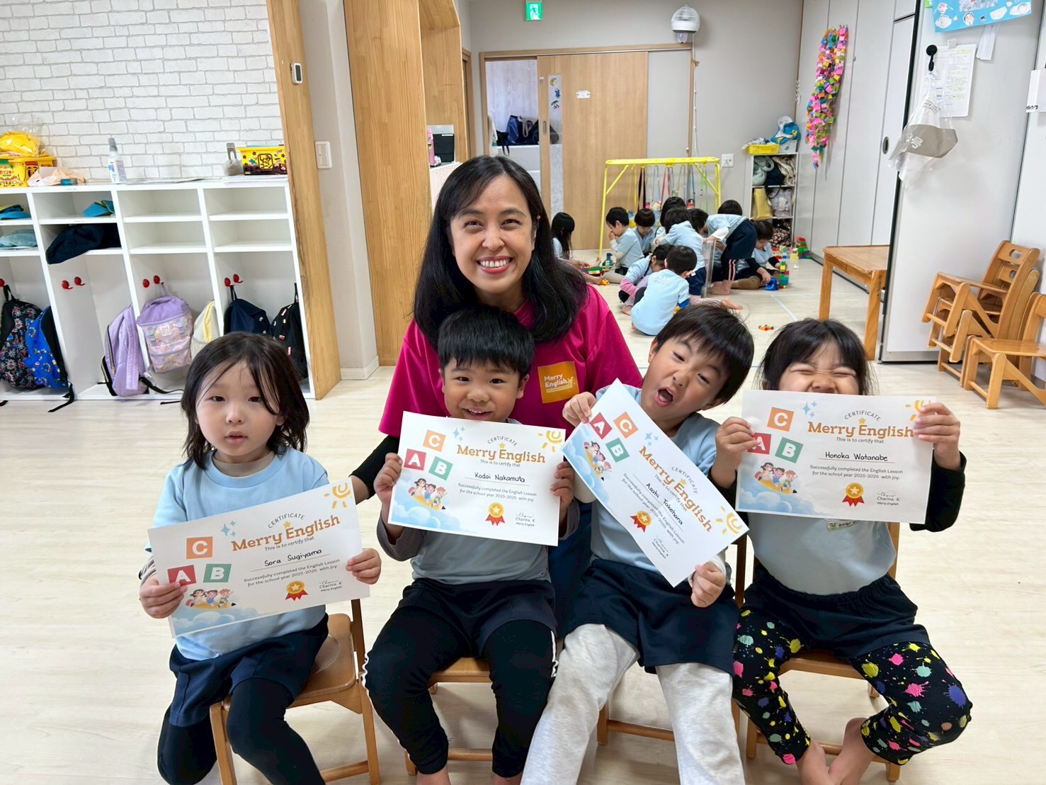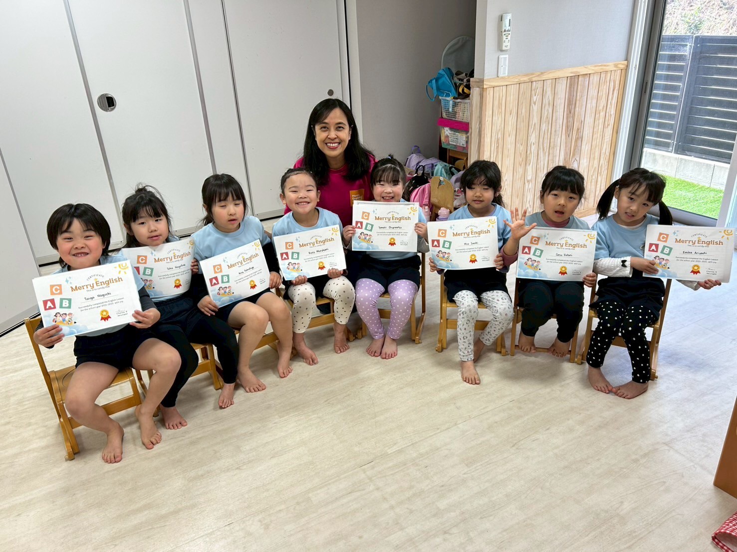 今年度、英語レッスンを頑張ったでしょう☺️の修了証明書🏆をもらって嬉しそうにニコニコ☺️‼️
